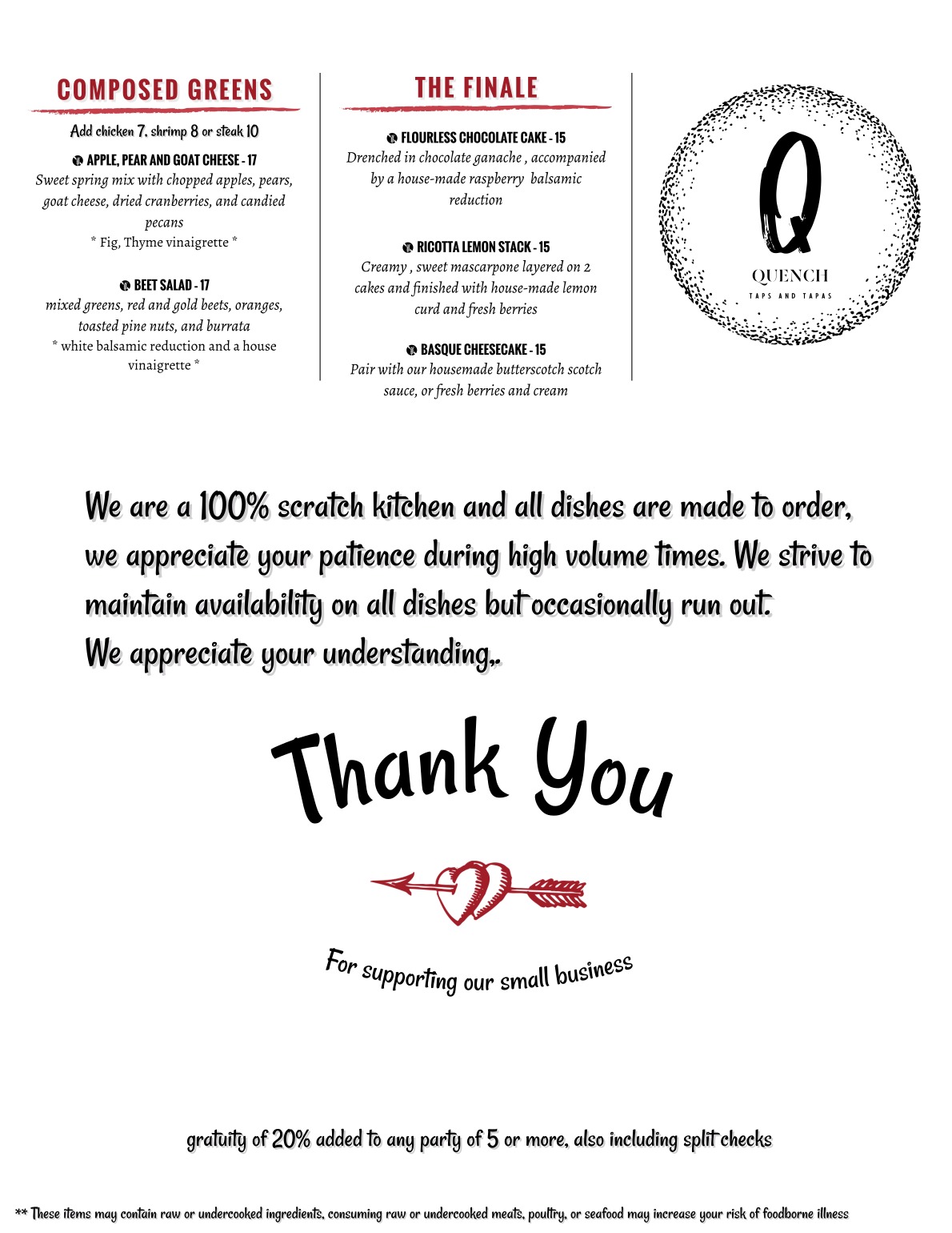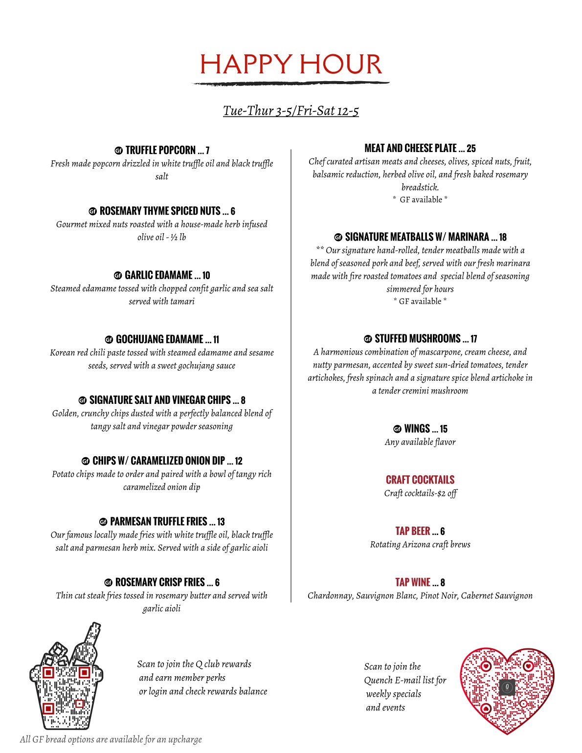 At Quench Taps and Tapas, every dish begins with a commitment to scratch-made excellence. Our chef-owner handpicks the finest ingredients to create a menu rich in flavor and variety, including extensive gluten-free options and housemade breads and desserts. With over 55 wines, crafted cocktails using fresh syrups, and a rotating selection of Glycol system chilled Arizona craft beers, we deliver a dining experience rooted in passion and precision. Our dedicated team shares this vision, ensuring every guest enjoys exceptional food and drink in a welcoming atmosphere.